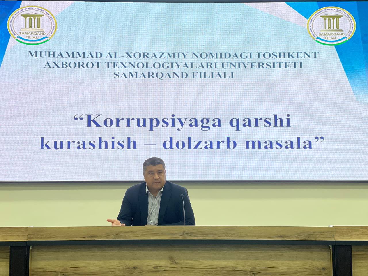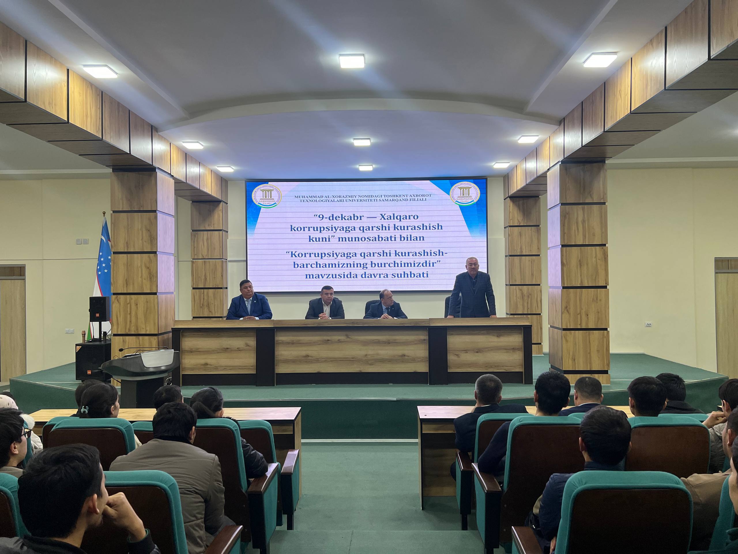 Muhammad al-Xorazmiy nomidagi Toshkent axborot texnologiyalari universiteti Samarqand filiali professor-oʻqituvchilari hamda xodimlariga “Korrupsiyaga qarshi kurashish - dolzarb masala” mavzusida tadbir o'tkazildi. Kompyuter injiniringi fakultetida “9-dekabr - Xalqaro korrupsiyaga qarshi kurashish kuni” munosabati bilan “Korrupsiyaga qarshi kurashish-barchamizning burchimizdir" mavzusida davra suhbati hamda 9-dekabr – Xalqaro korrupsiyaga qarshi kurashish kuni munosabati bilan TATU Samarqand filialida “Korrupsiyadan holi ta’lim muassasasi” shiori ostida “Ochiq eshiklar kuni” oʻtkazildi.